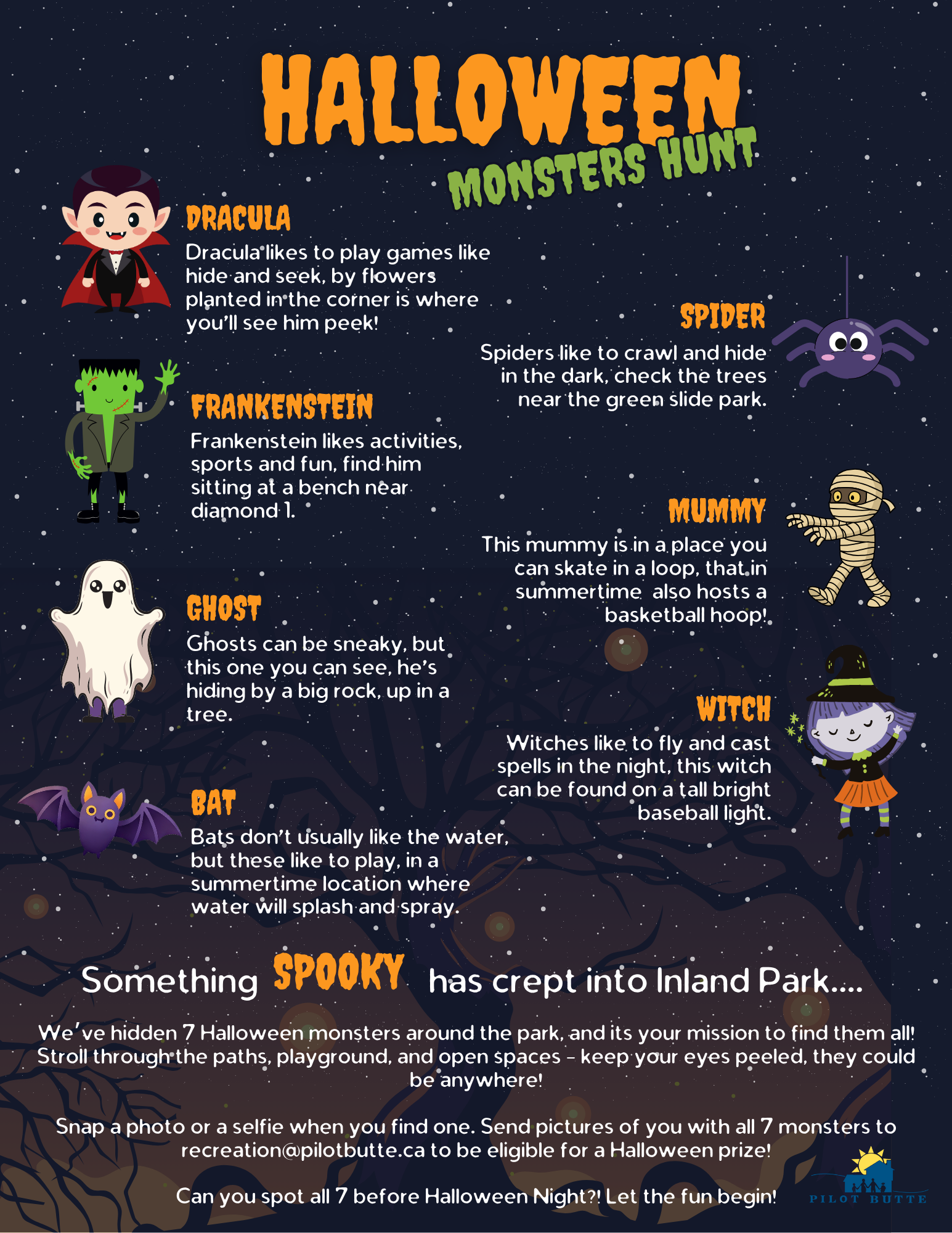 Visit Inland Park and search for all 7 hidden Halloween monsters (location hints are on the poster!👀).