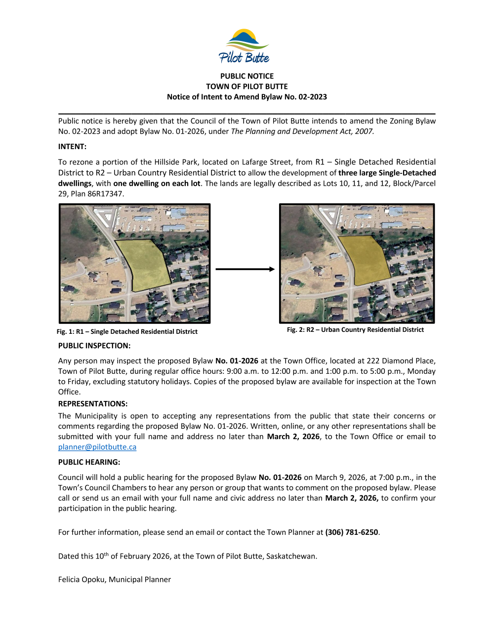 REPRESENTATIONS: The Municipality is open to accepting any representations from the public that state their concerns or comments regarding the proposed Bylaw No. 01-2026. Written, online, or any other representations shall be submitted with your full name and address no later than March 2, 2026, to the Town Office or email to planner@pilotbutte.ca