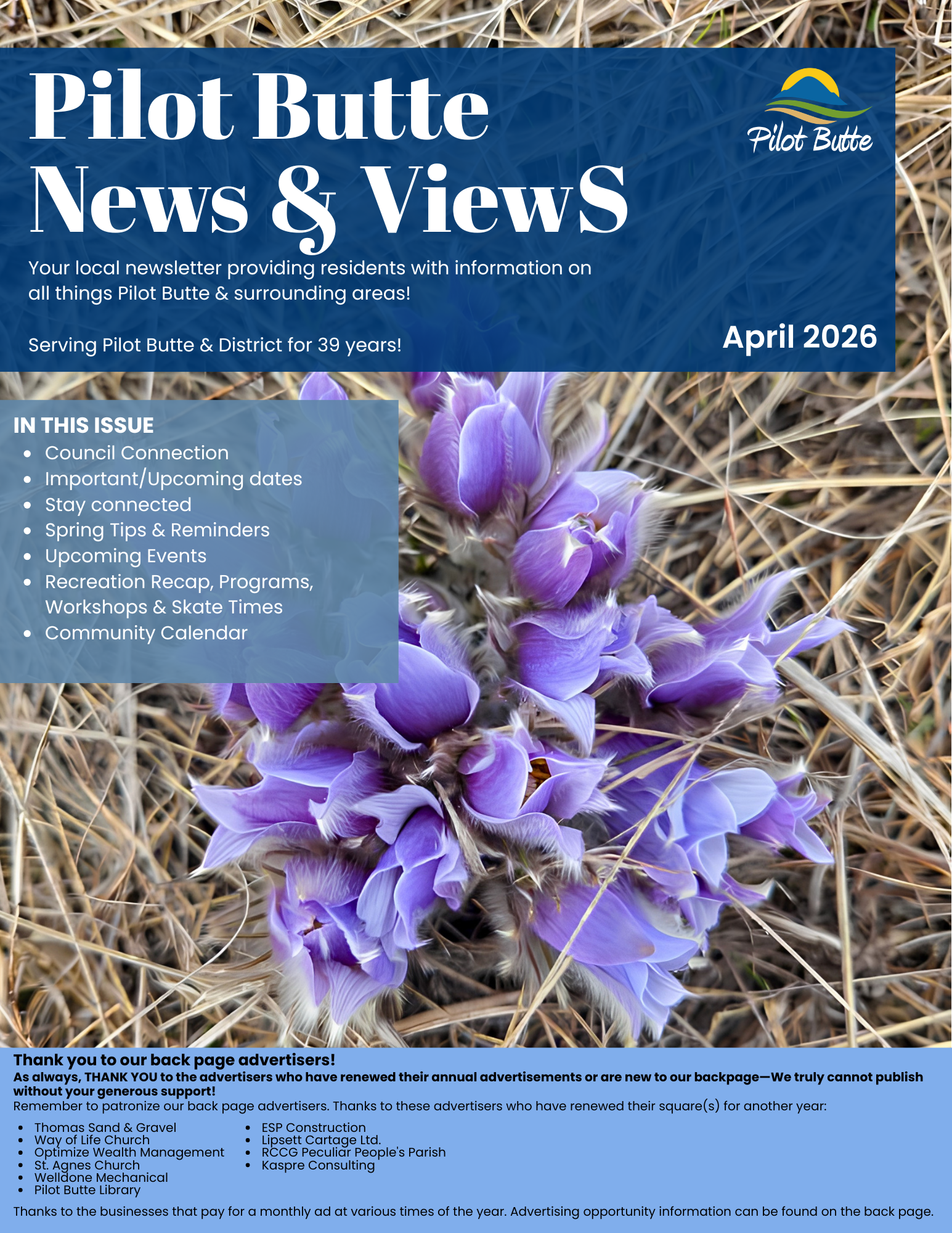 All submissions due by the 20th of the month. Any submission received after the 20th may be inserted at the discretion of the News and viewS. Please send submissions as a .pdf or .jpeg or .pub or .doc ready for insertion in the issue. For more information, please email newsletter@pilotbutte.ca