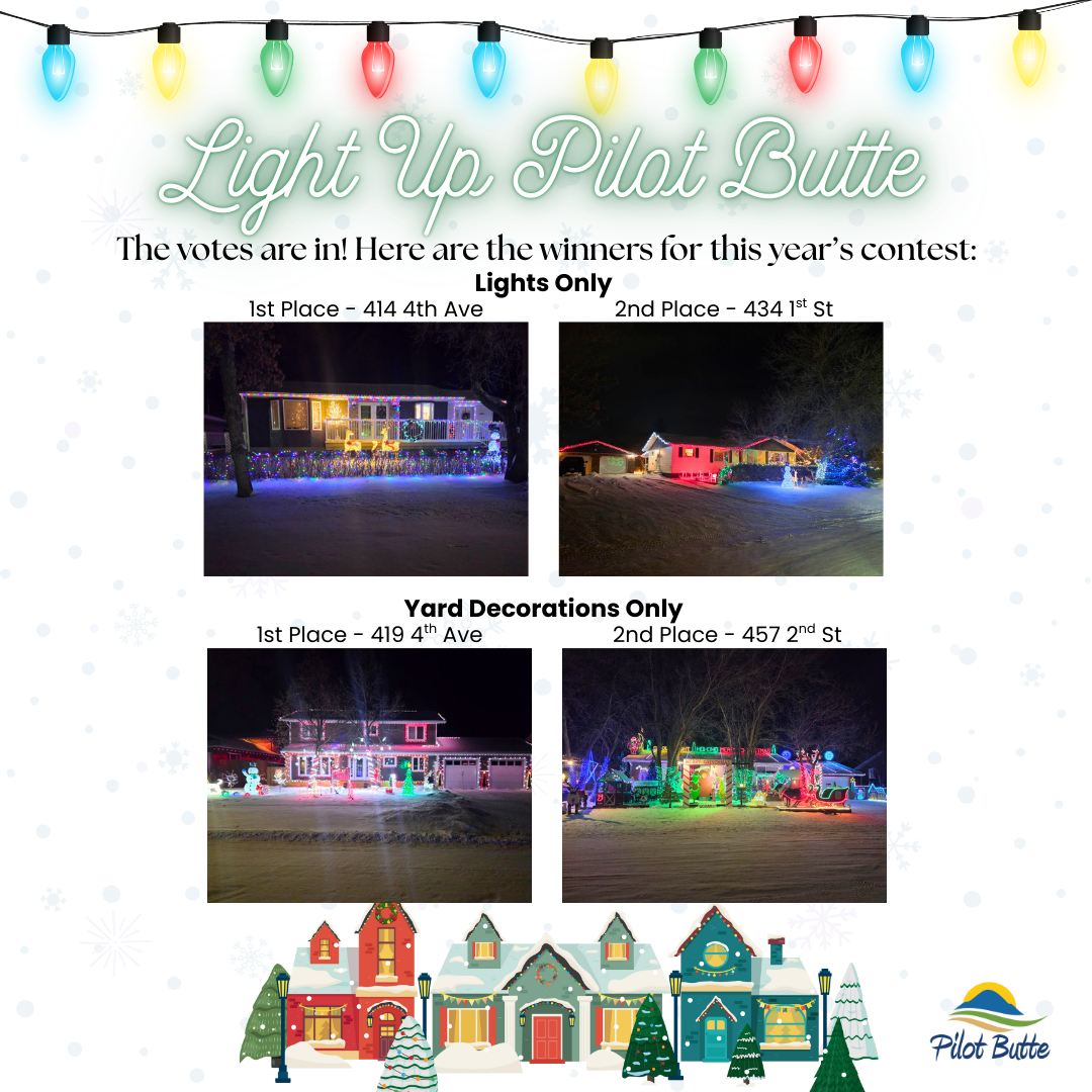 It was wonderful to see so many beautifully decorated homes throughout Pilot Butte this holiday season. A big thank you to everyone who nominated a home, nominated others, and took the time to vote. Your participation truly helped spread holiday cheer across our community!