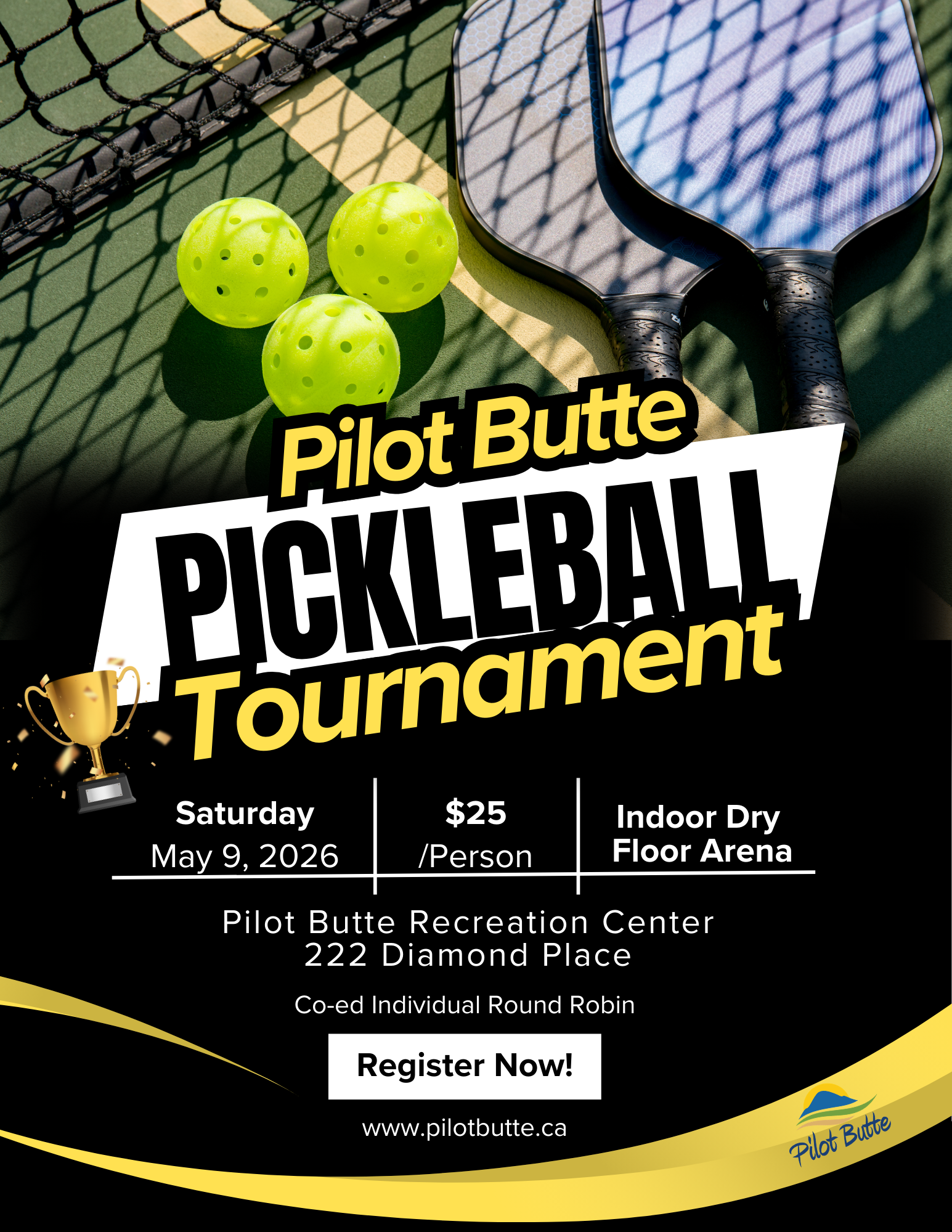 The Town of Pilot Butte is excited to host a co-ed Pickleball Tournament on May 9, 2026, at the Pilot Butte Recreation Centre!