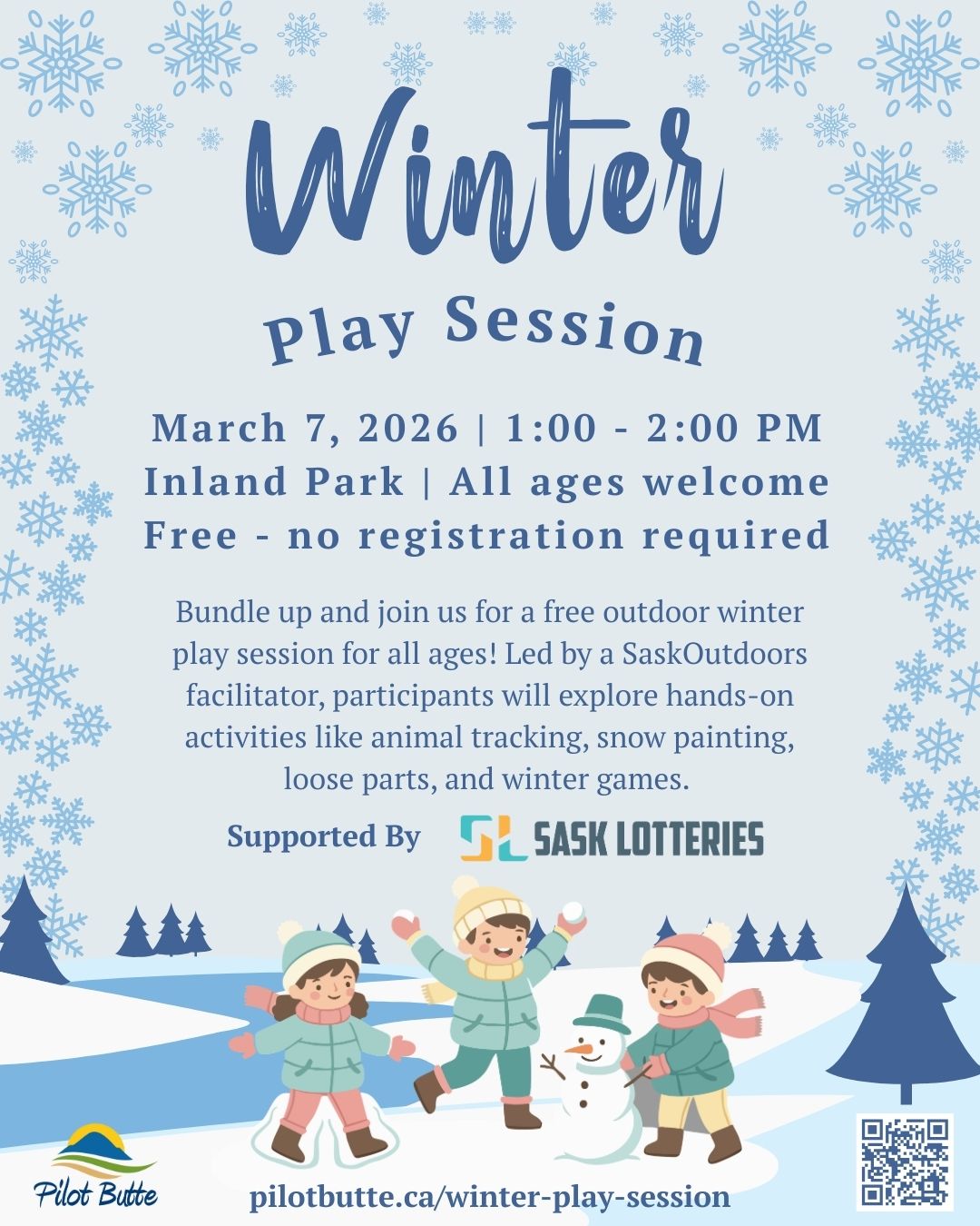 Bundle up and join us for a free outdoor winter play session for all ages! Led by a SaskOutdoors facilitator, participants will explore hands-on activities such as animal tracking, snow painting, loose parts, and winter games.